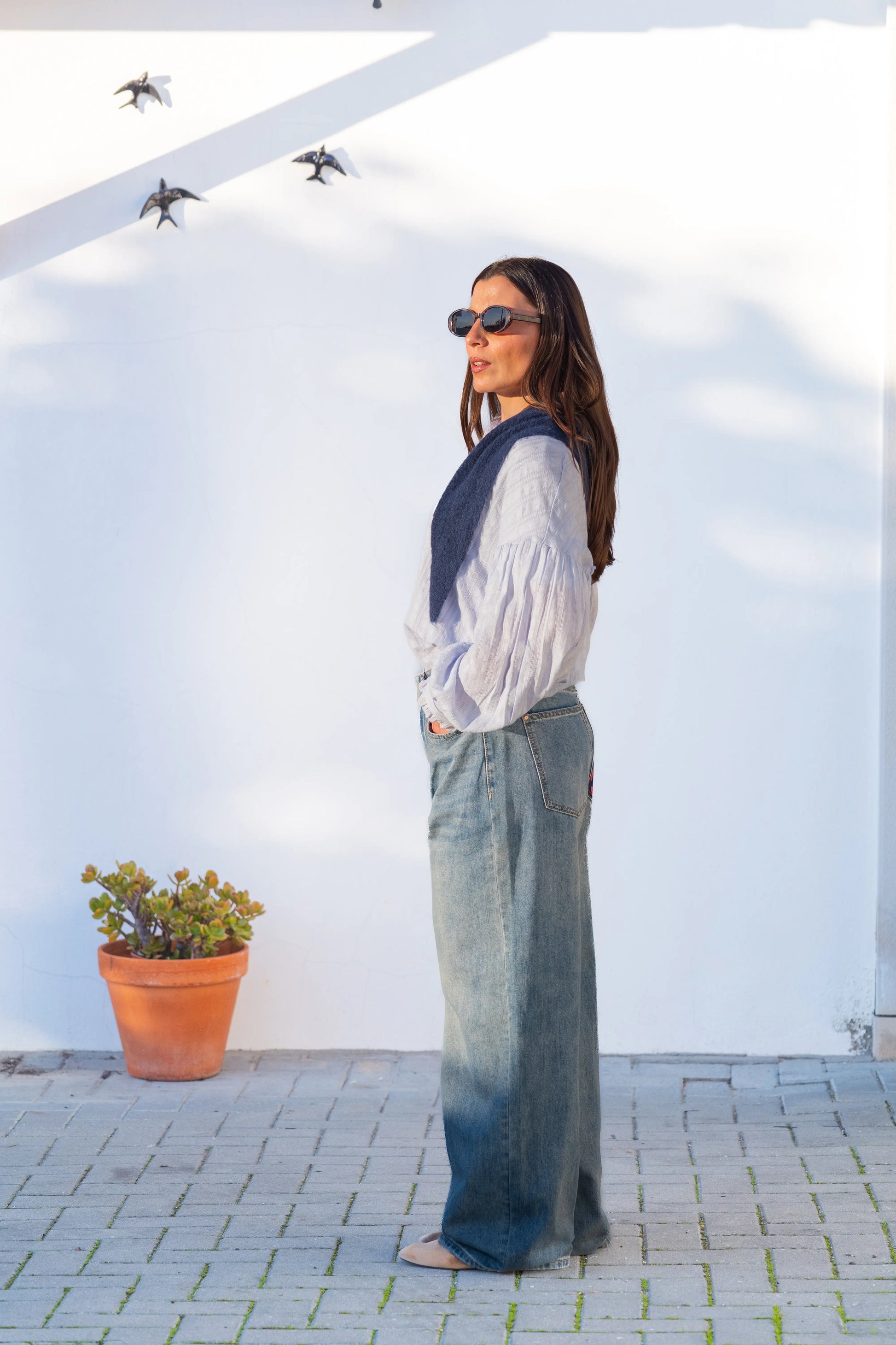Calças de ganga de corte largo e cintura média, com um estilo descontraído e moderno.