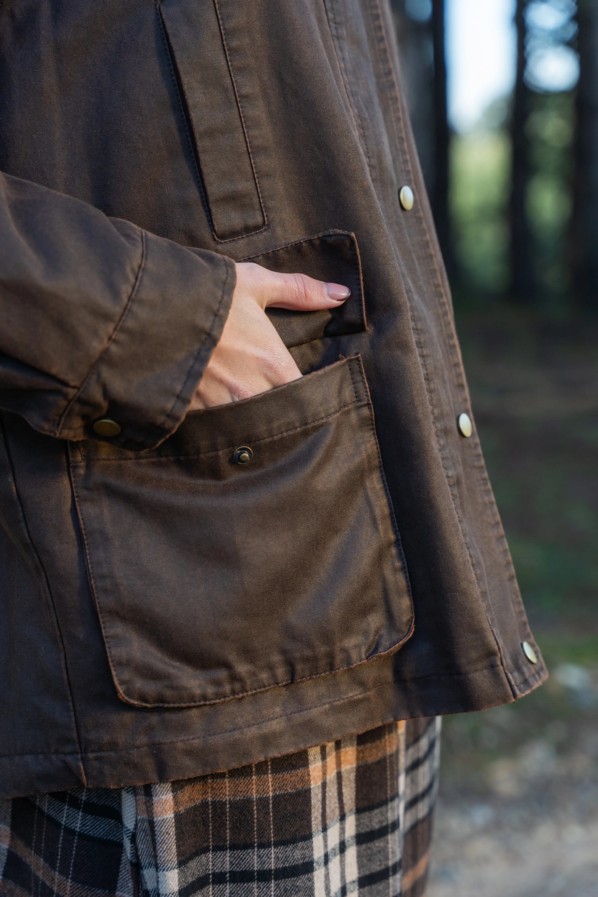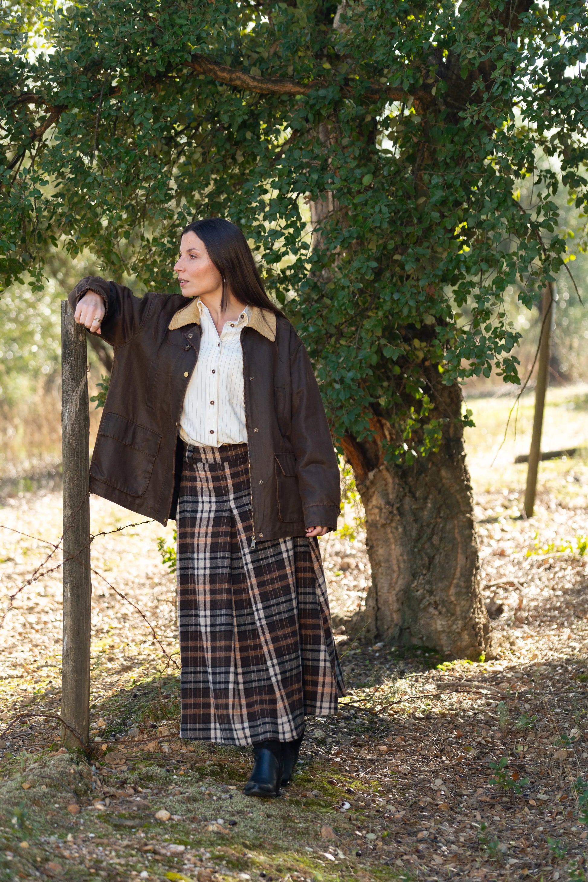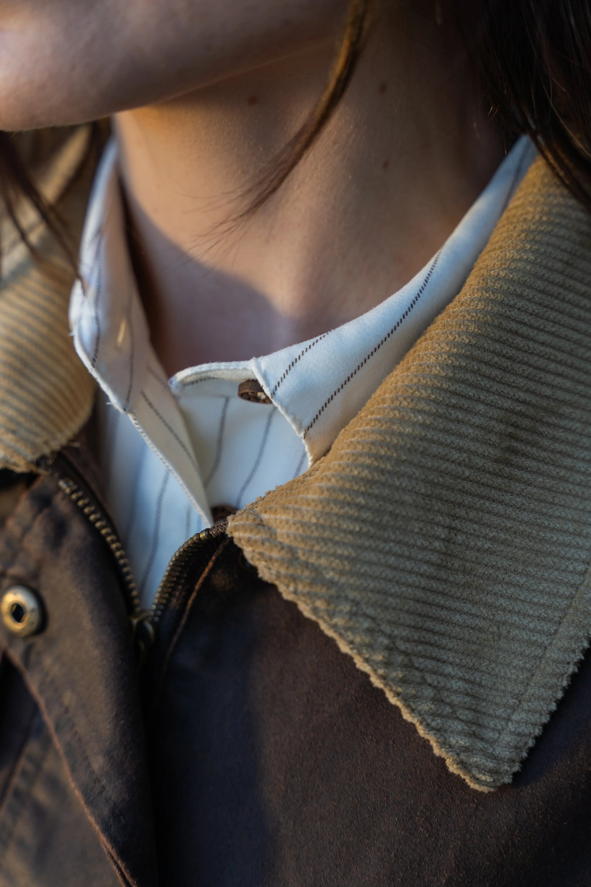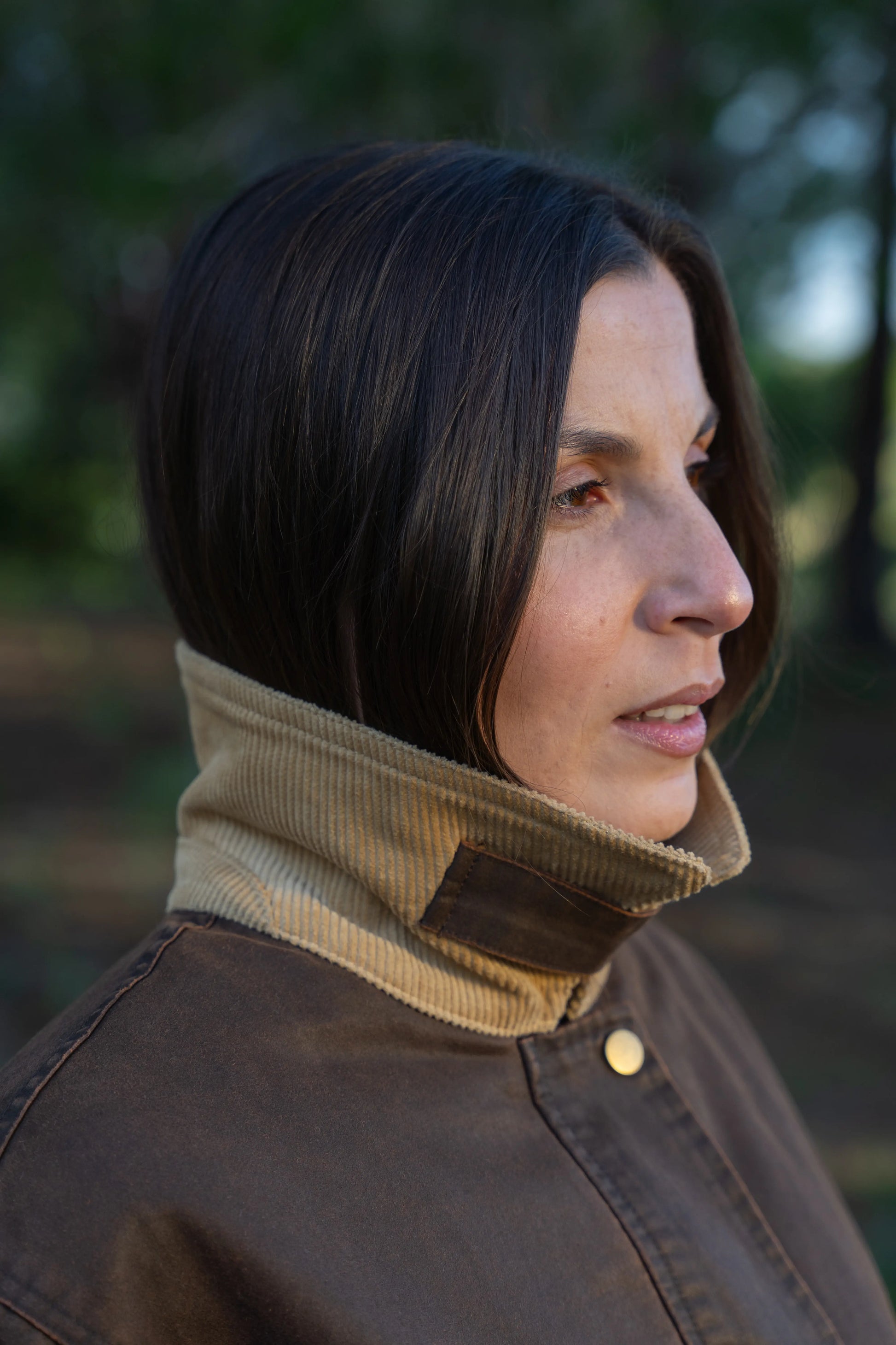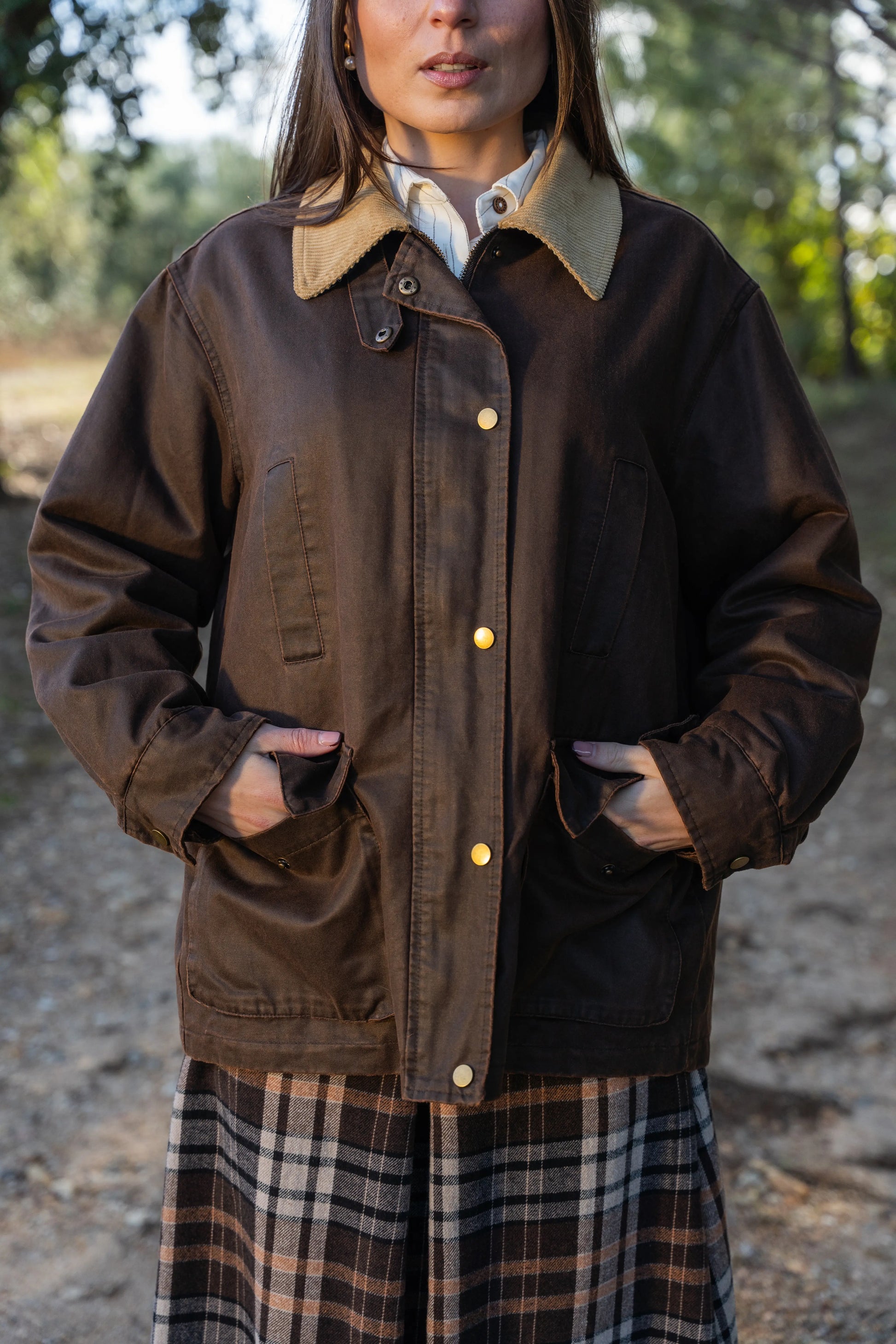 Casaco castanho design clássico e intemporal. Confeccionado em tecido robusto com acabamento ligeiramente encerado, é ideal para os dias frios e húmidos de outono e inverno. Gola em bombazina bege, que adiciona textura e um toque vintage; Fecho frontal com molas metálicas e vista oculta para maior proteção térmica; Dois bolsos frontais com aba e dois bolsos superiores embutidos, práticos e discretos; Corte reto e ligeiramente oversized, garantindo conforto e liberdade de movimento.