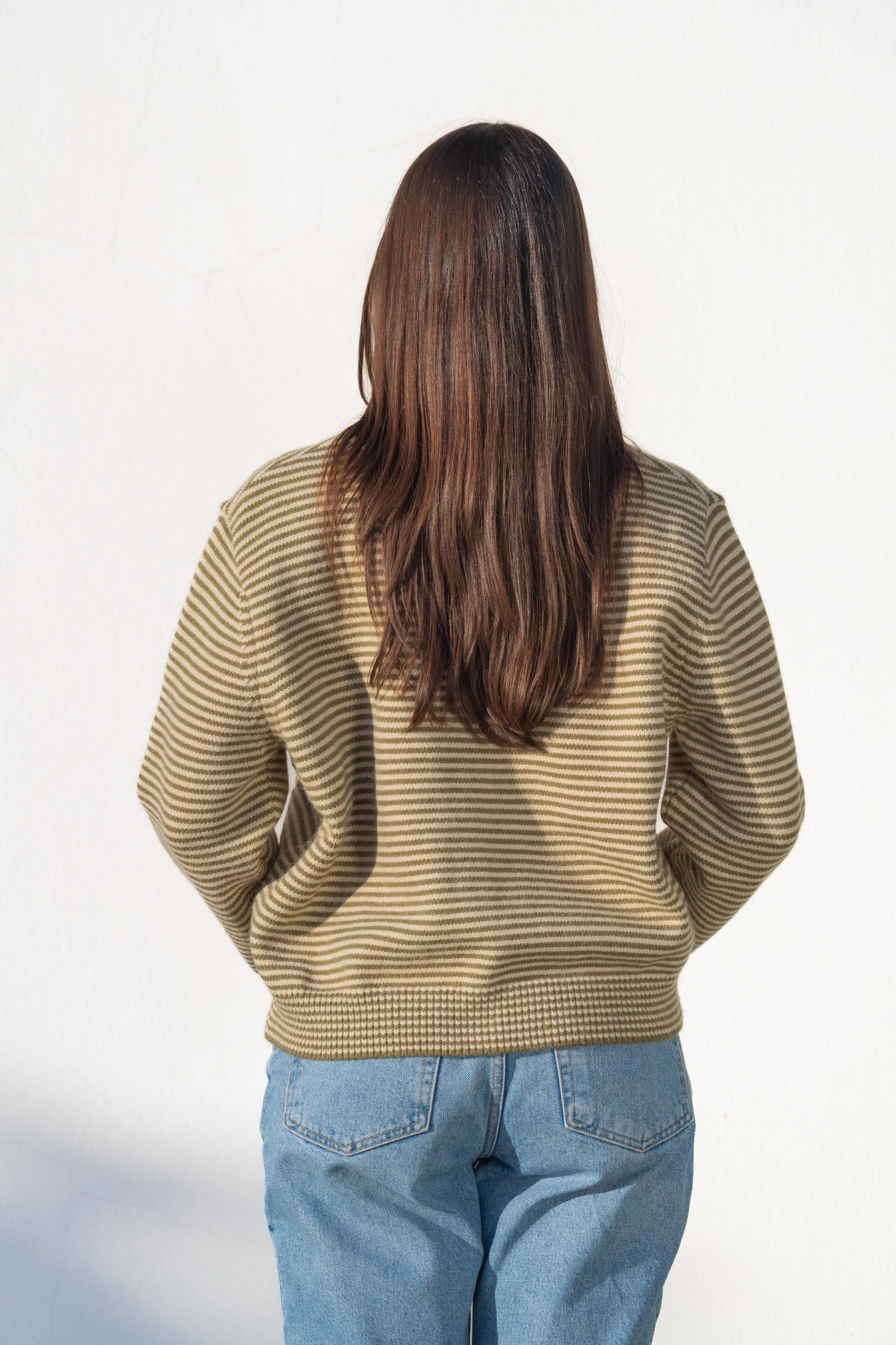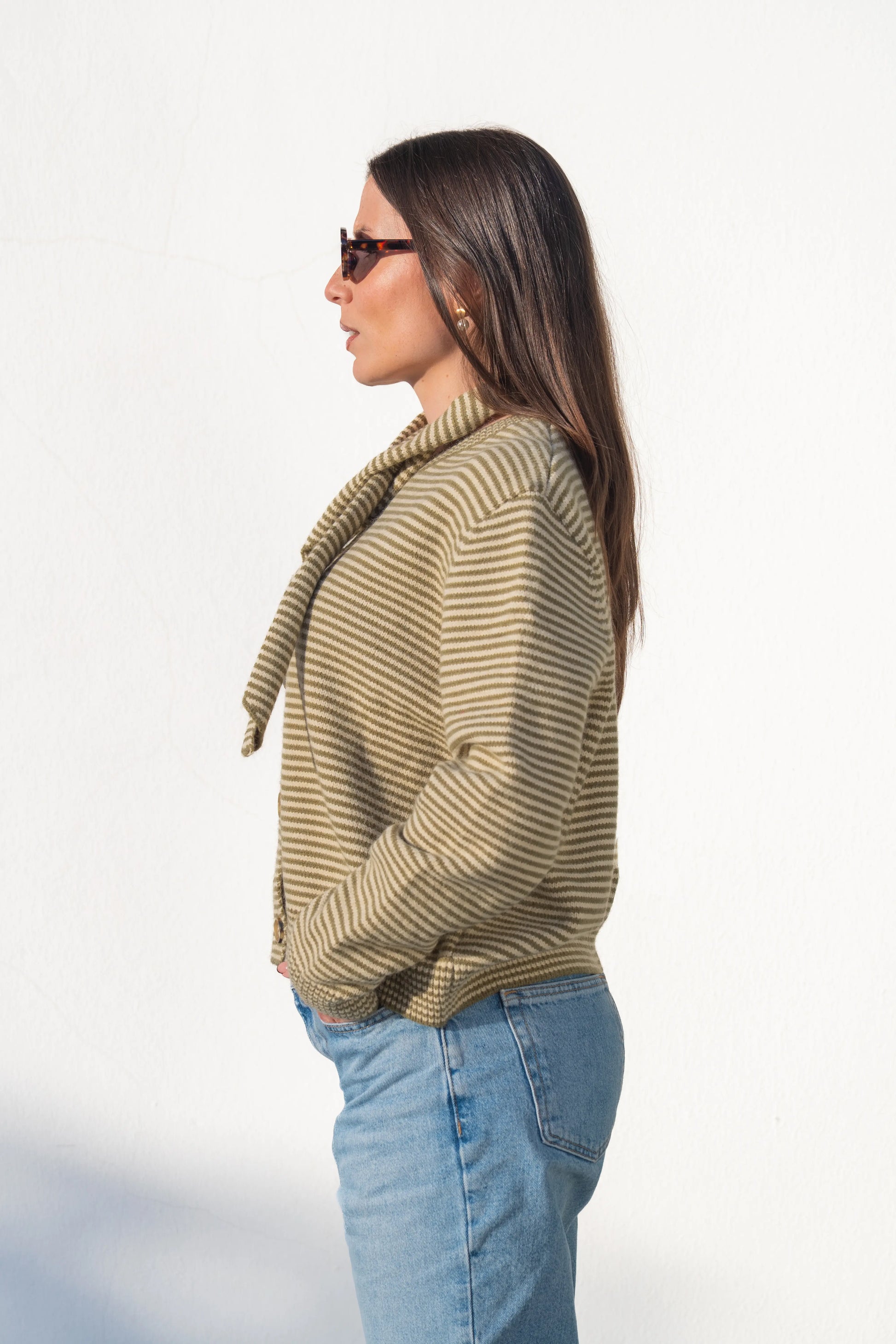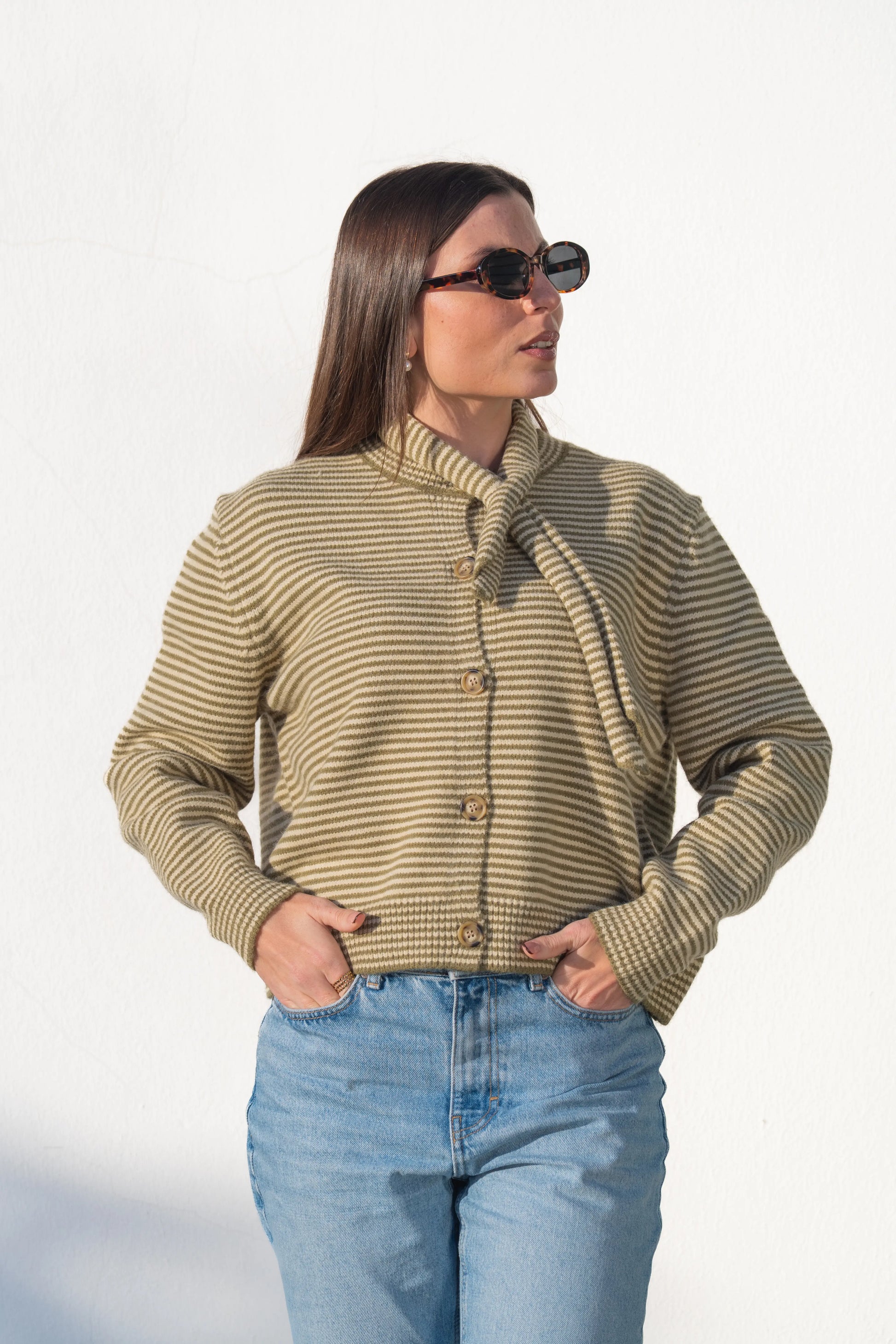 Cardigã em malha tricotada com padrão de riscas horizontais verde e cru. Echarpe removível, permitindo criar laço, nó ou cair solta para um visual descontraído. Corte reto e ligeiramente curto, ideal para coordenar com calças de cintura subida ou saias midi. Fecho: Frontal com botões em tom natural. Tecido: Malha macia e confortável, de toque quente e leve.