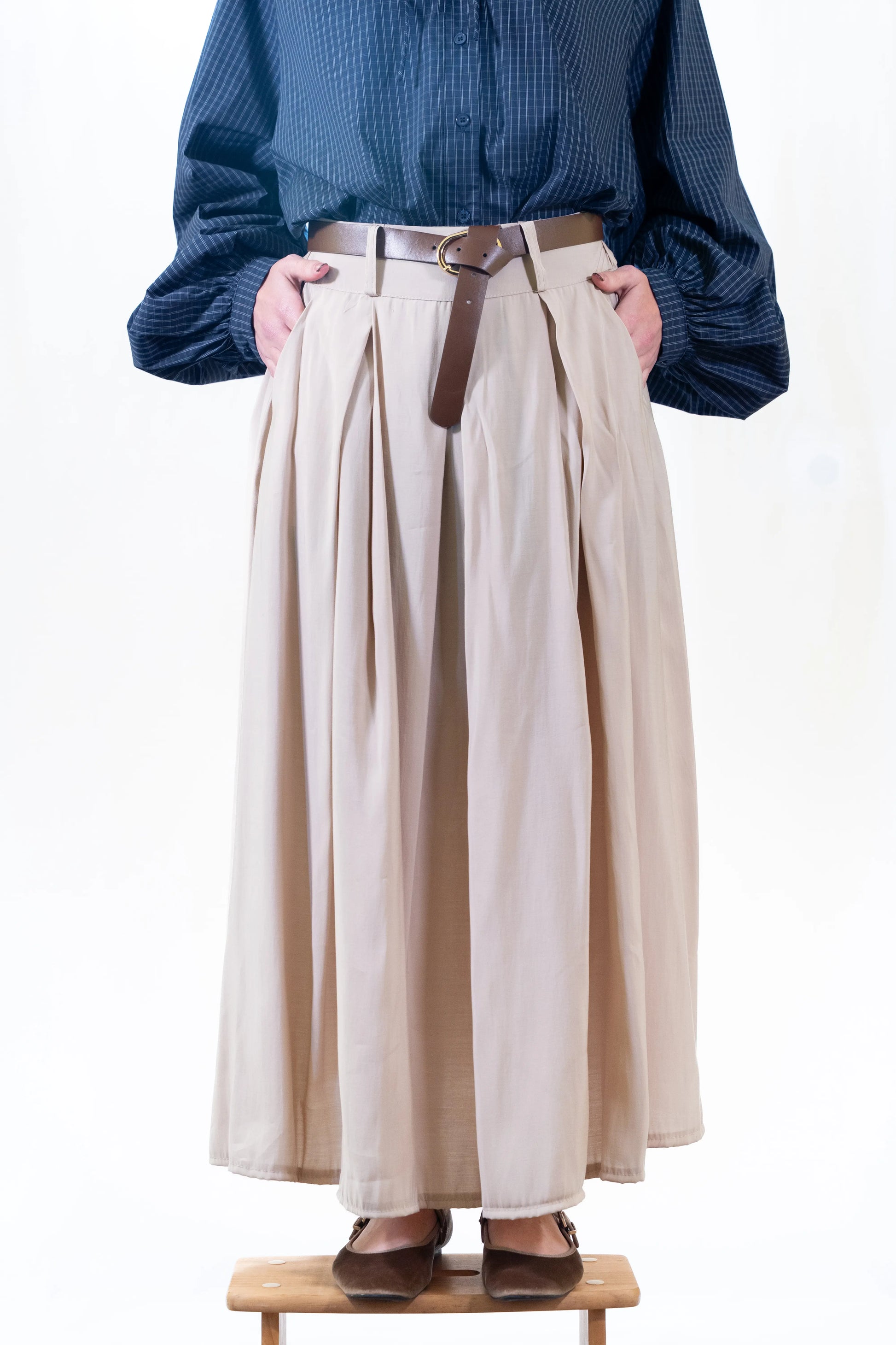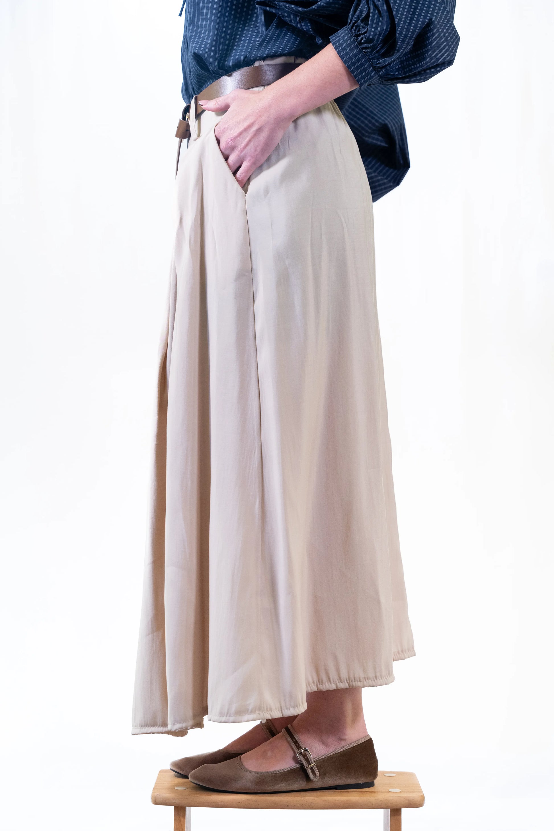 Saia midi de corte evasé com pregas amplas, que criam um movimento fluido e elegante.
