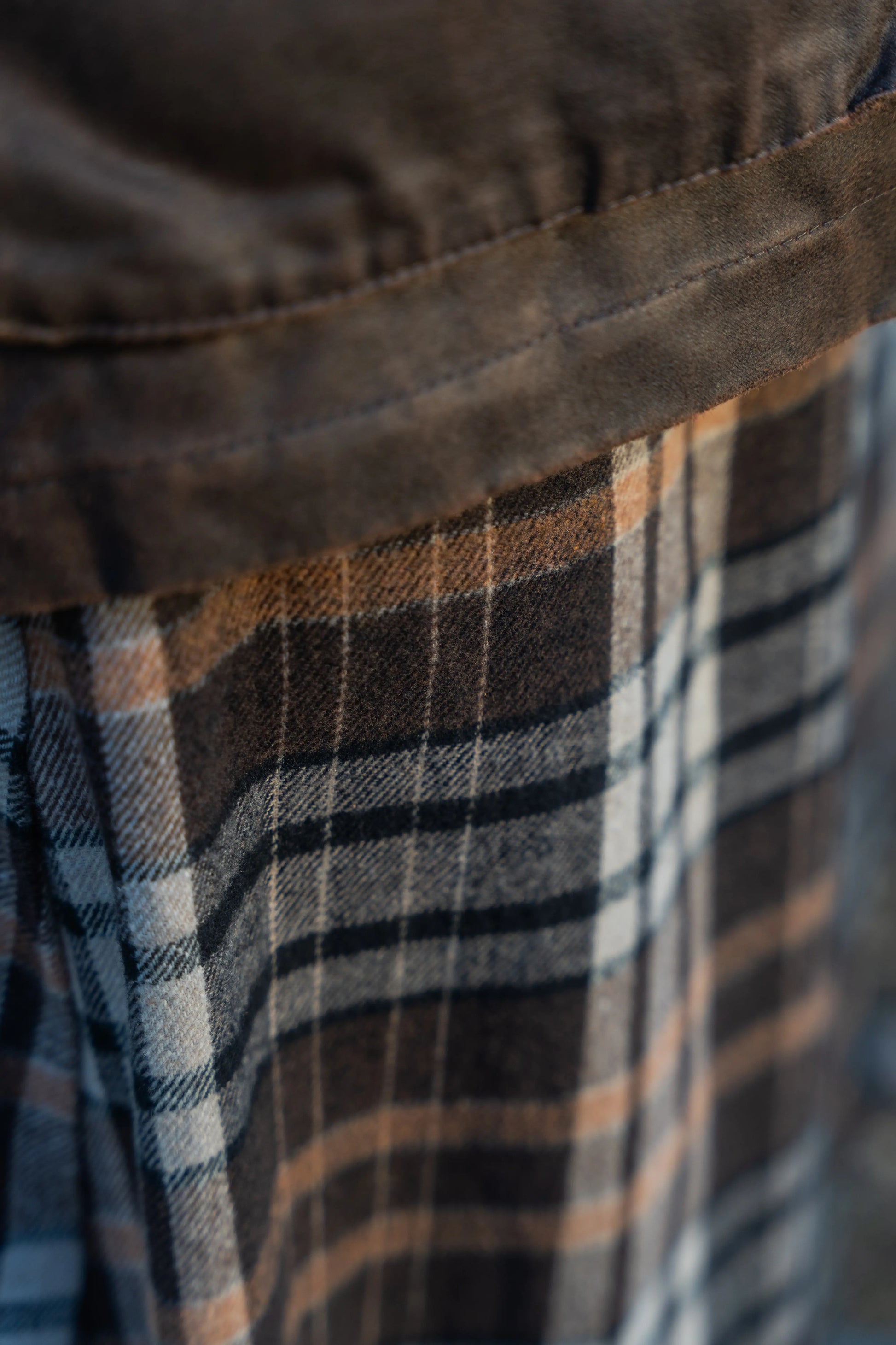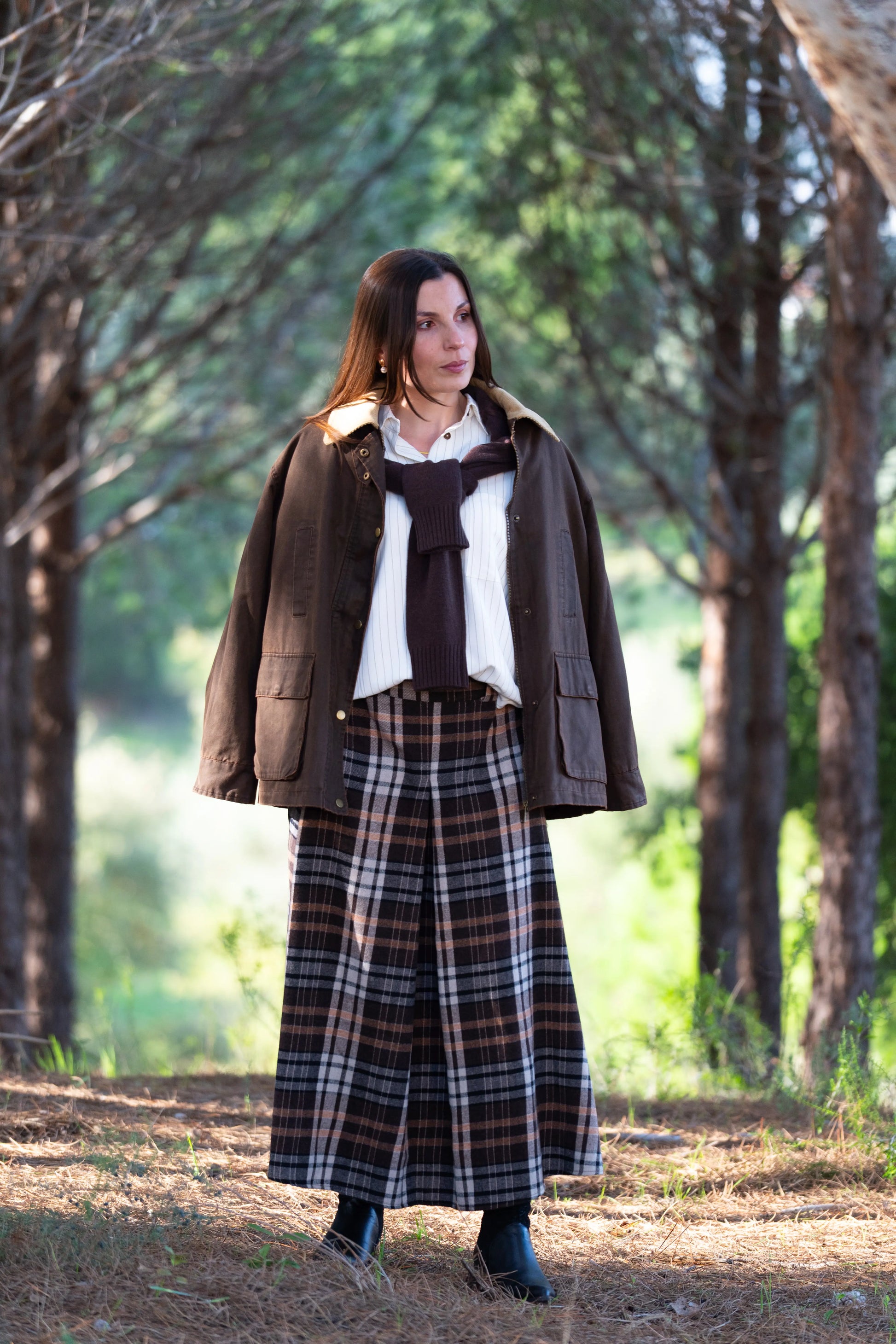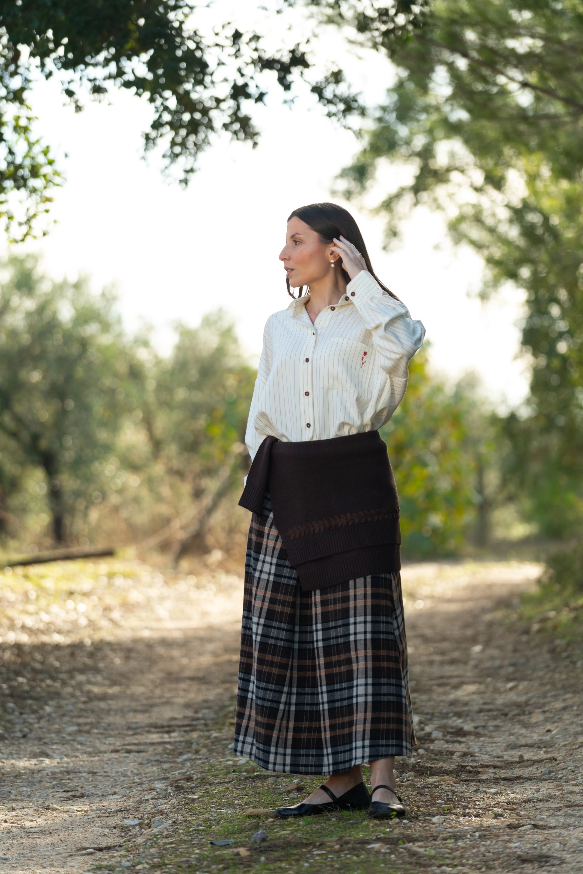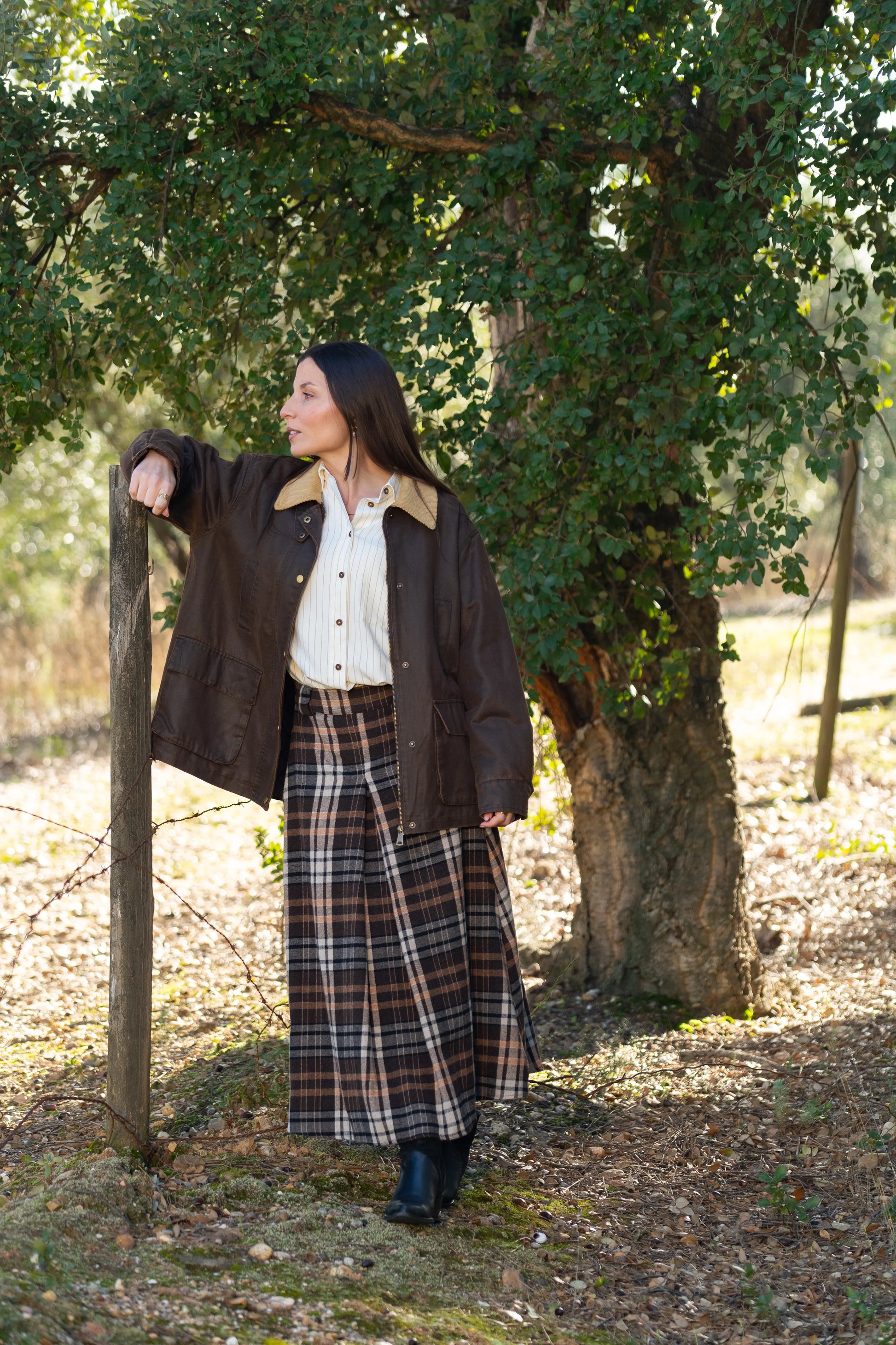 Saia midi confecionada em tecido de fazenda macio, com padrão xadrez clássico em tons de castanho, bege e preto.