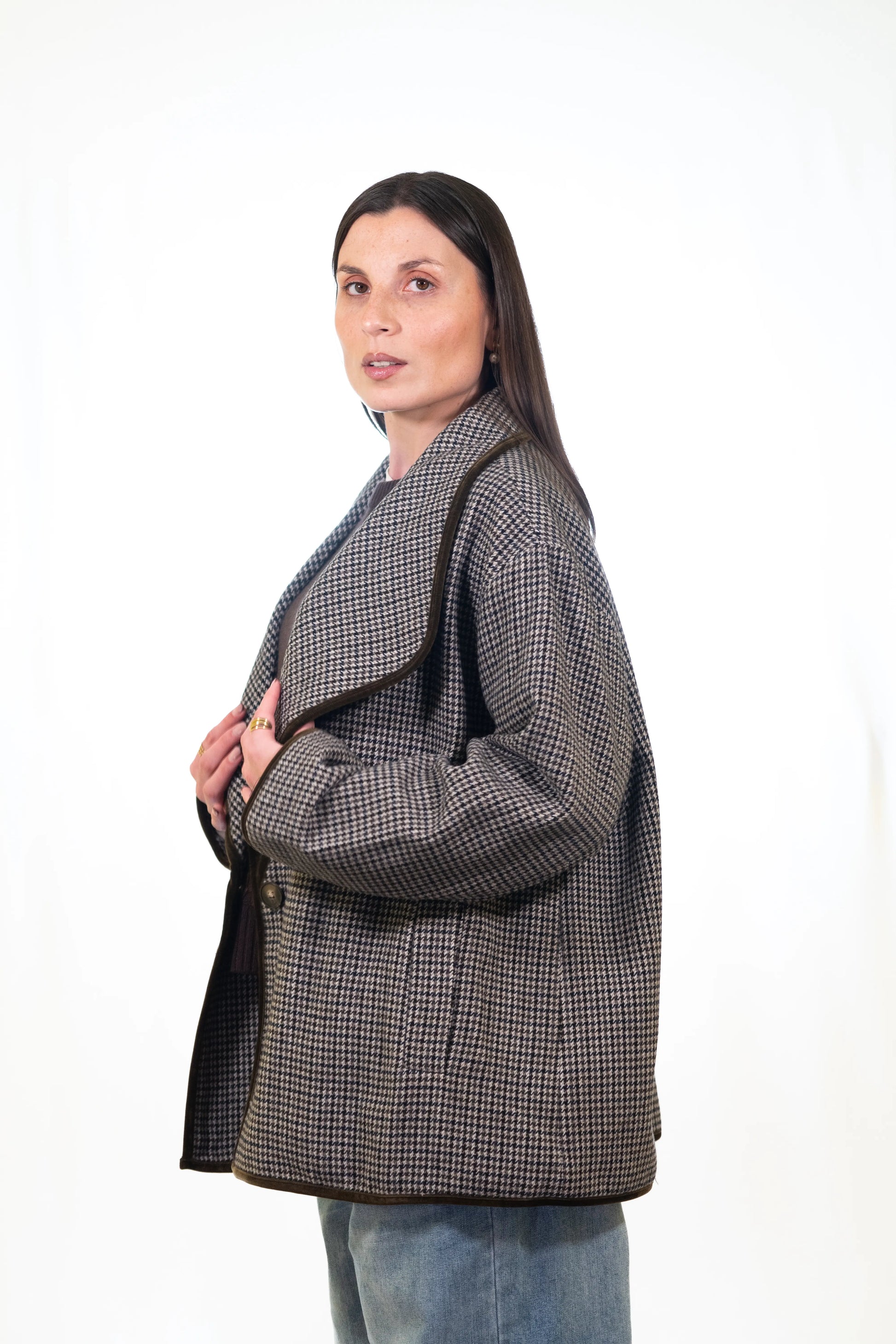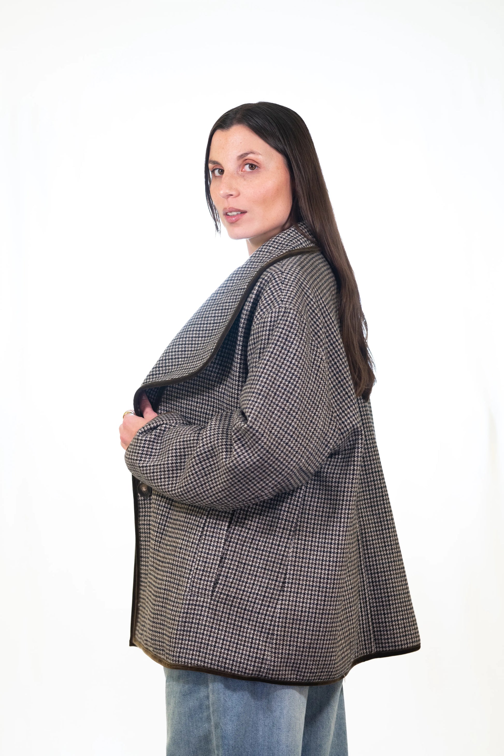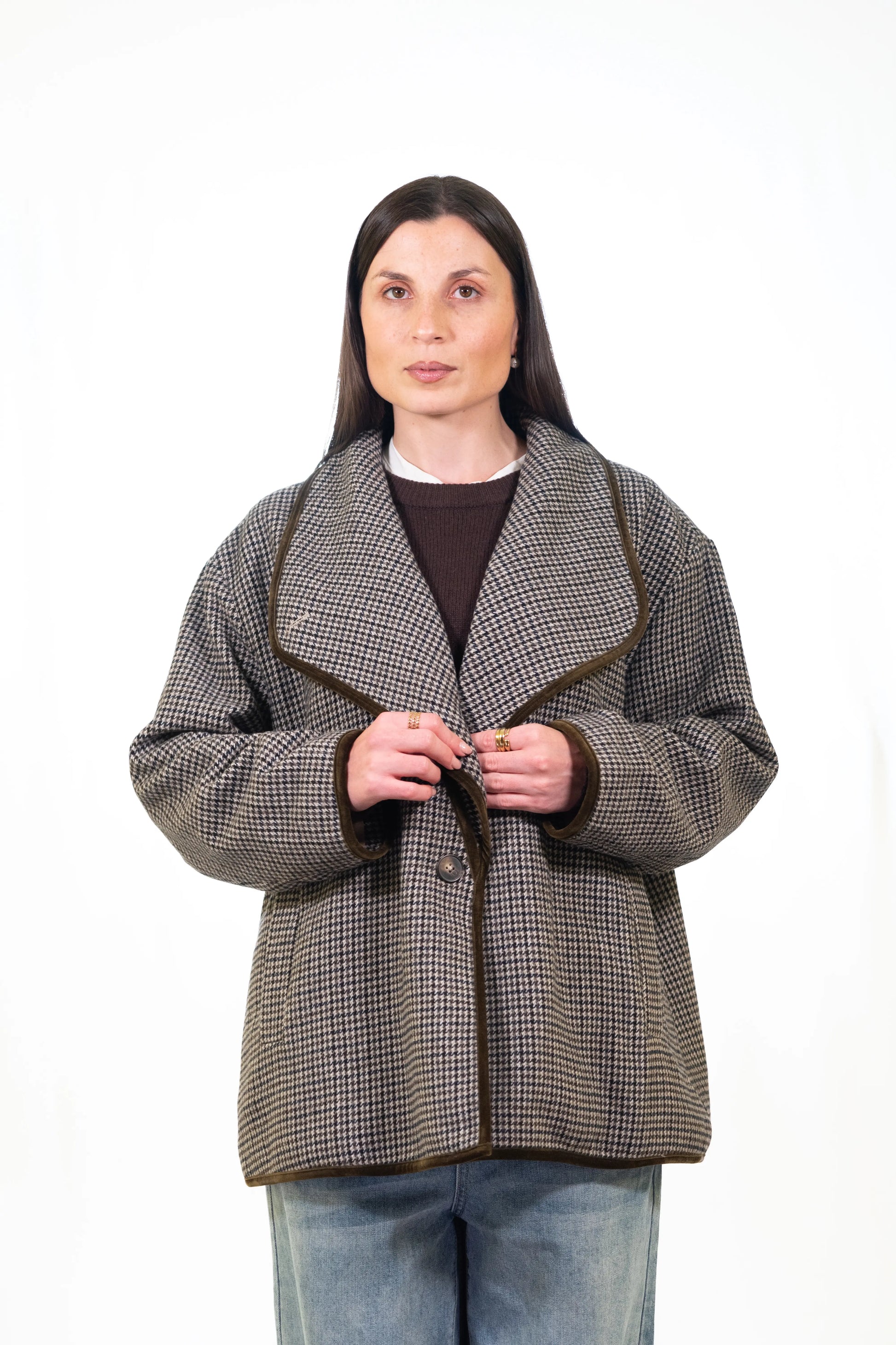 Sobretudo curto em tecido de fazenda com padrão pied-de-poule (preto e branco), corte solto e estruturado com caimento elegante. Gola larga forrada com debrum verde-azeitona que contorna toda a peça. Bolsos: Dois bolsos frontais embutidos, práticos e funcionais. Mistura estilo clássico com contemporâneo.