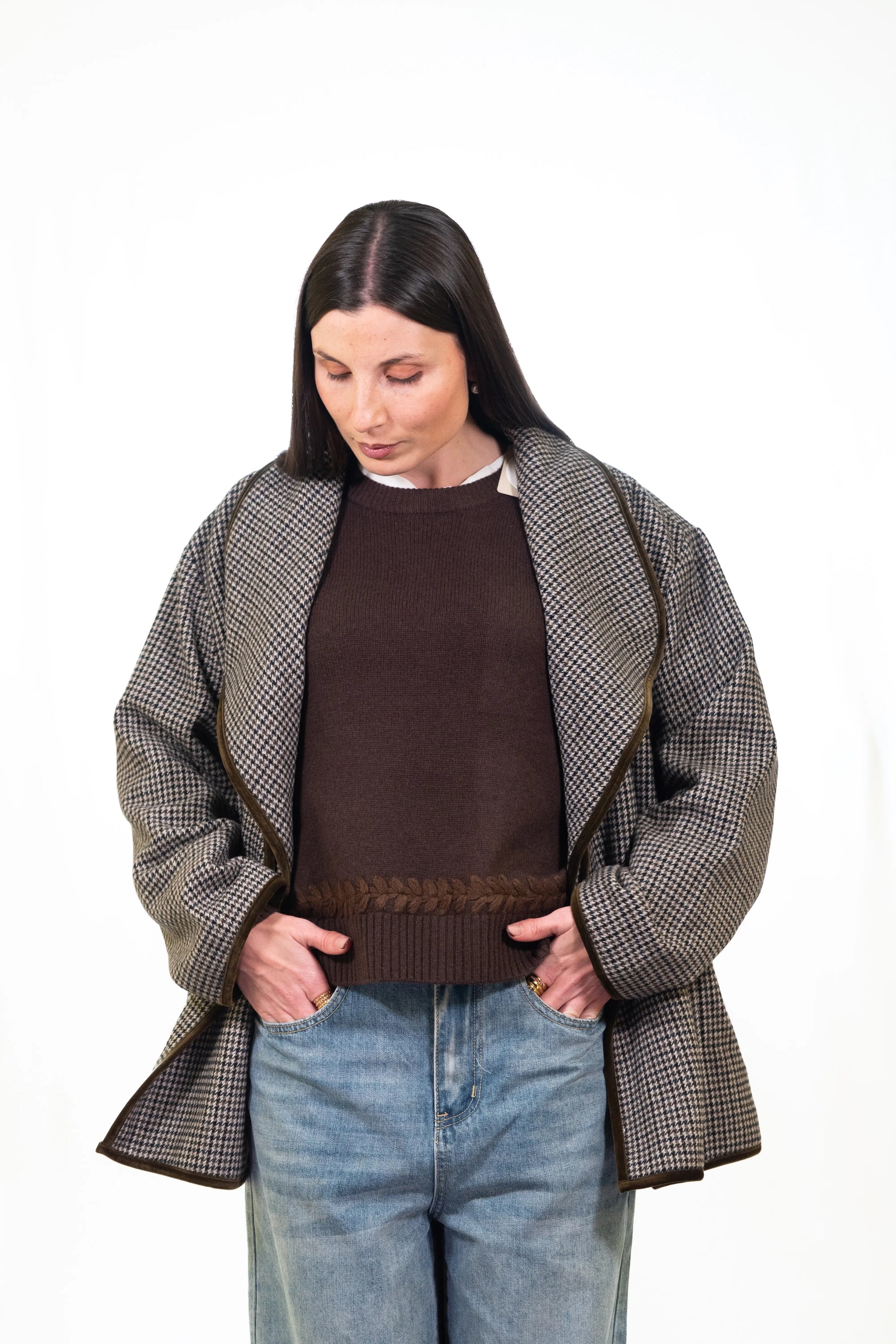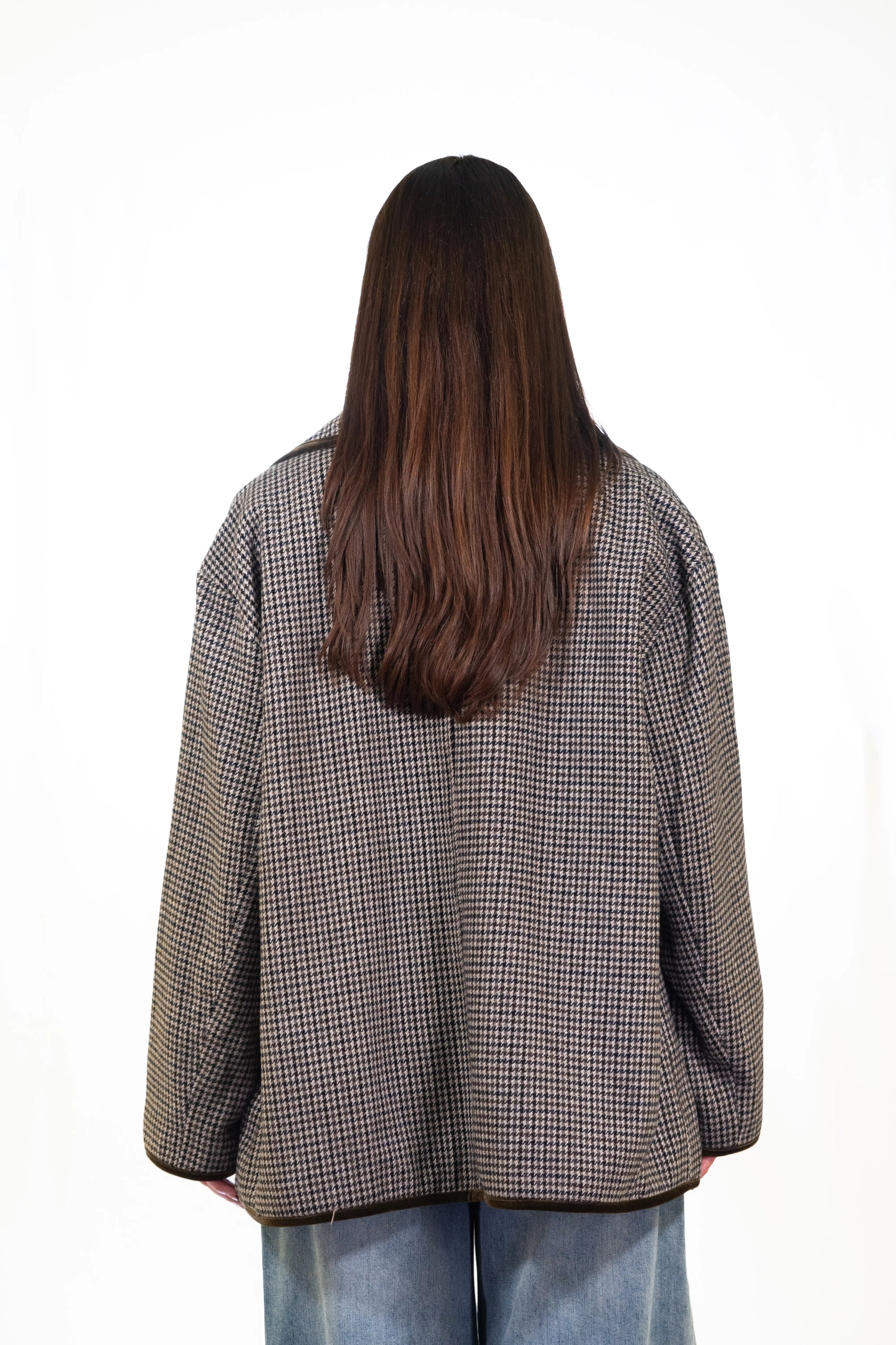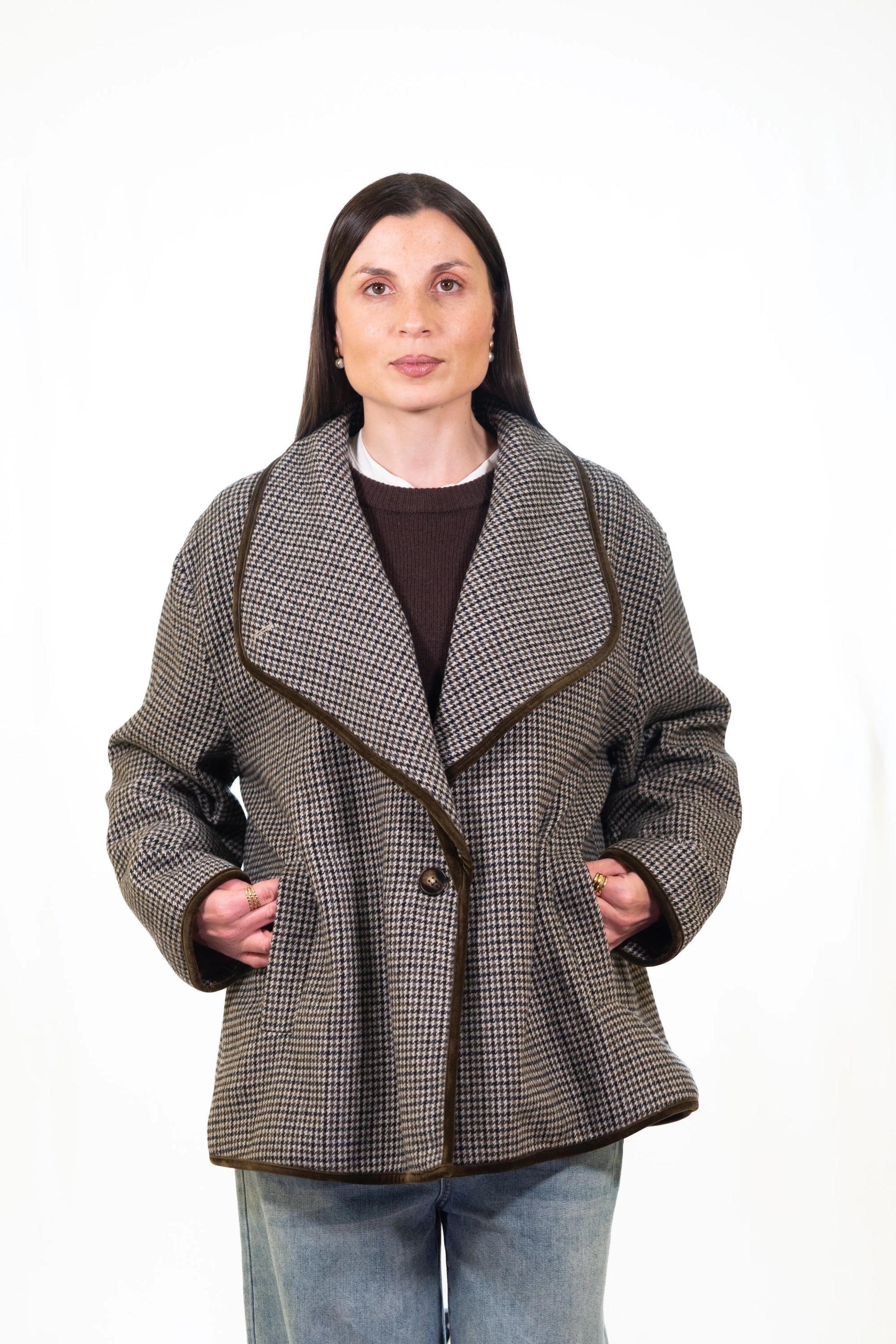 Sobretudo curto em tecido de fazenda com padrão pied-de-poule (preto e branco), corte solto e estruturado com caimento elegante. Gola larga forrada com debrum verde-azeitona que contorna toda a peça. Bolsos: Dois bolsos frontais embutidos, práticos e funcionais. Mistura estilo clássico com contemporâneo.